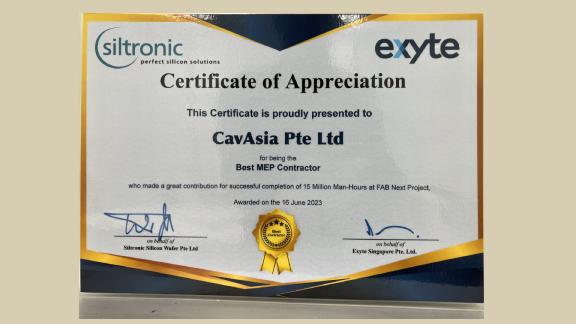 Certificate of Appreciation for being the Best MEP Contractor for Siltronic Project